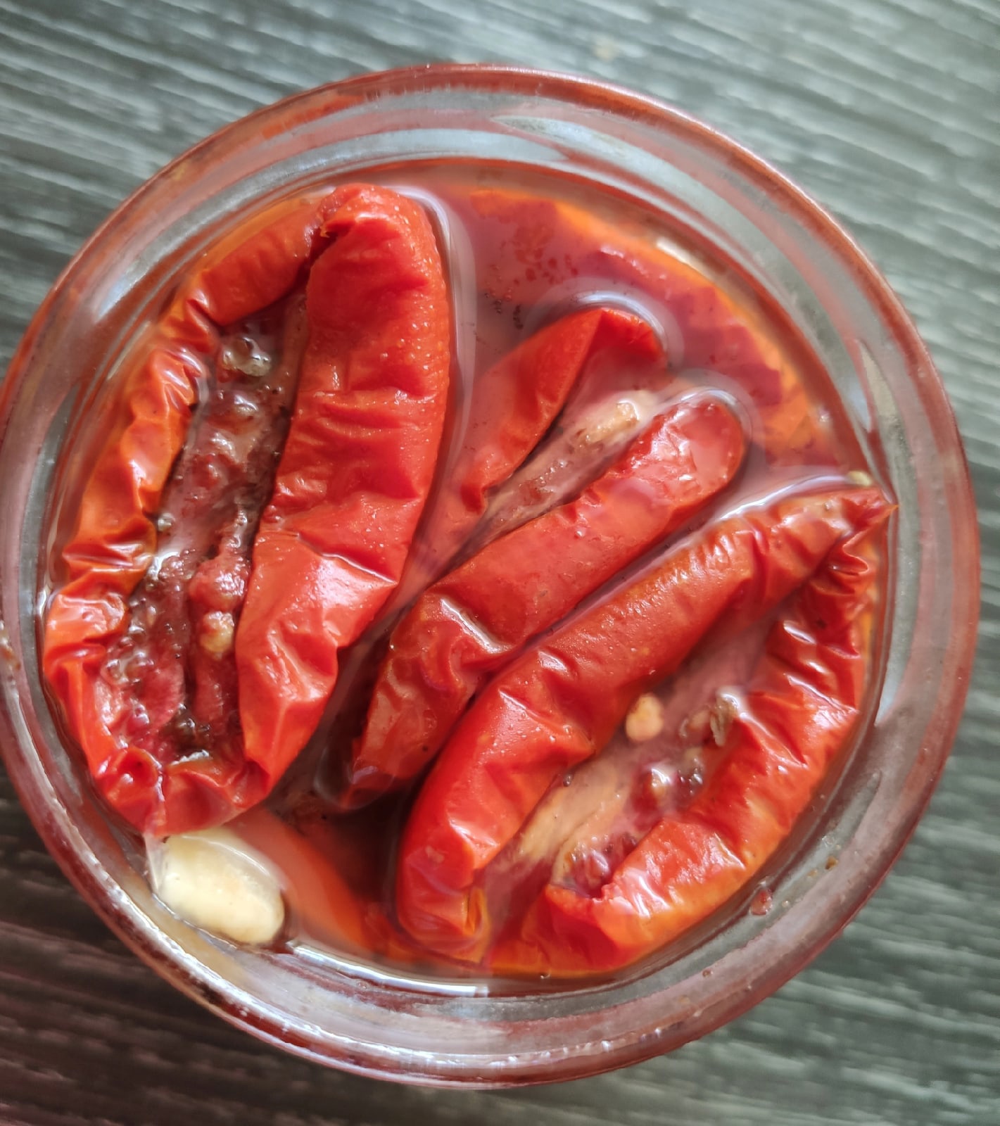 Уложите готовые томаты в банку и залейте хорошо прогретым растительным маслом с приправами.